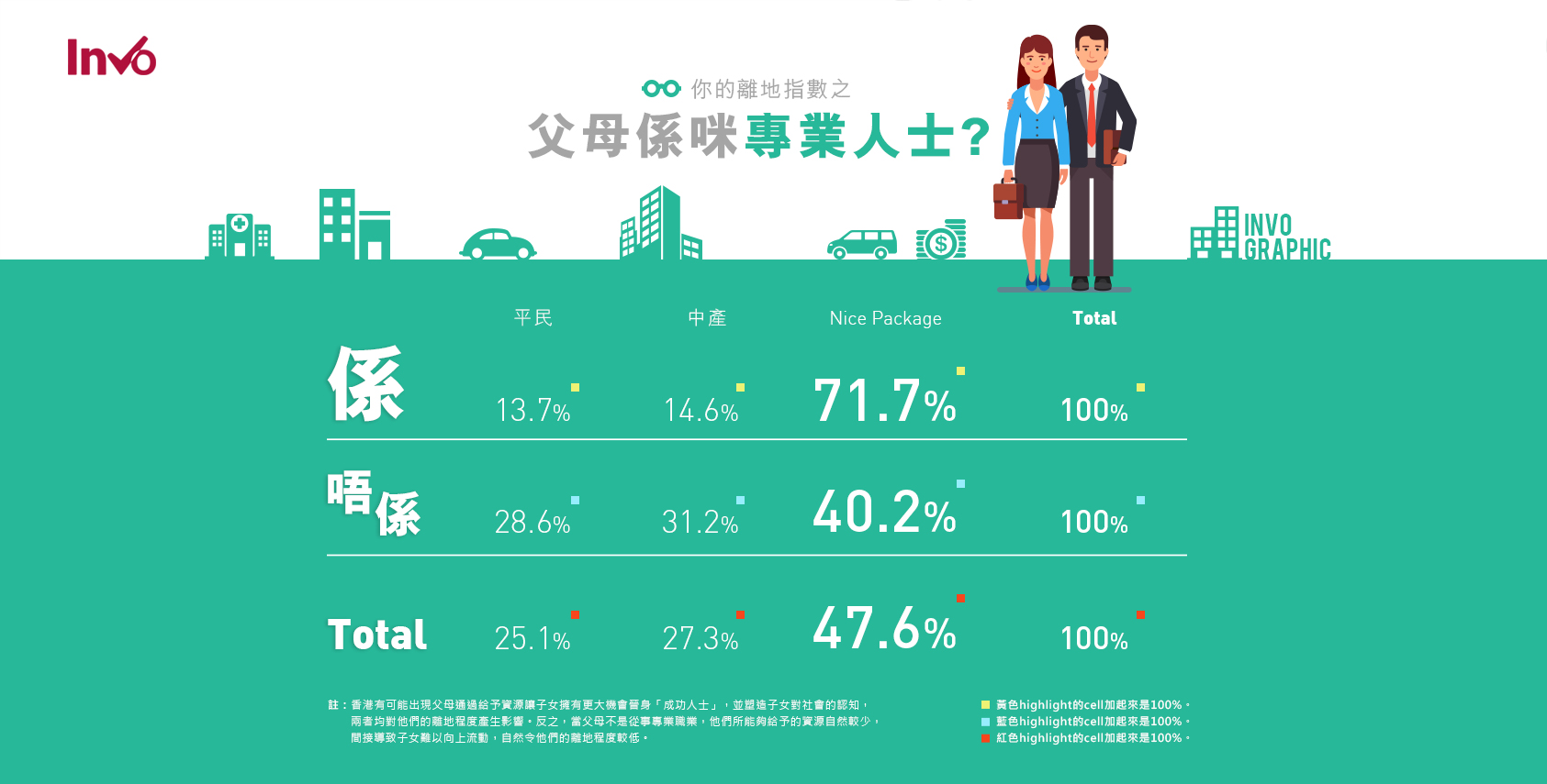 在整體階層分佈中,有近一半被訪者為「nice package」。不過細分被訪者的家庭背景後,若果被訪者的父母為專業人士,他們有逾七成的人屬於「nice package」。相對而言,當被訪者的父母不是專業人士,他們只有約四成人能晉身「nice package」。