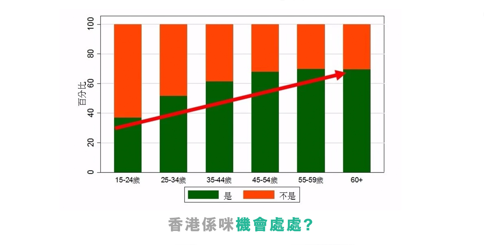 經過分析數據後,INVO 發現有40.2% 被訪者認為:香港不是一個機會處處的地方。進一步分析年齡組群,結果顯示年紀越小對香港前景感覺越悲觀,明顯反映代際認知差距。其中15-24歲的被訪者中,高達62.9%認為香港不是機會處處的地方,25-34歲的被訪者亦有接近一半否認香港機會處處,其餘年齡層的被訪者則有約三成否認香港是個機會處處的地方。
